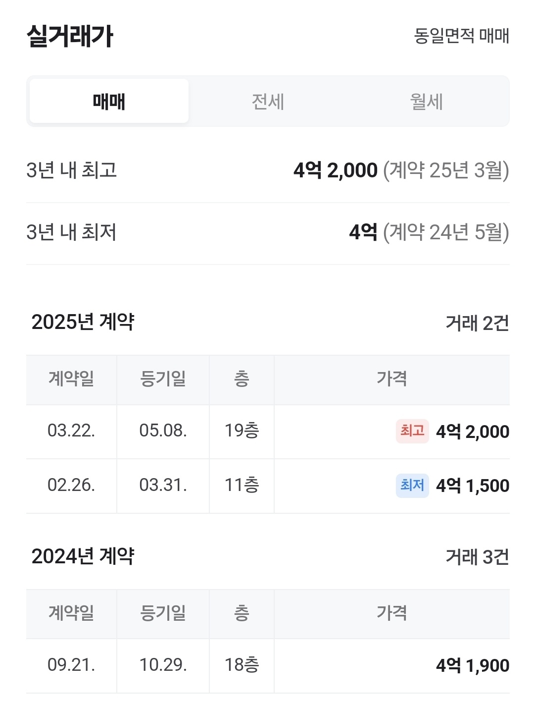 - 전용 59.98㎡ (18평): 최고·최저 모두 약 4.0억 원대