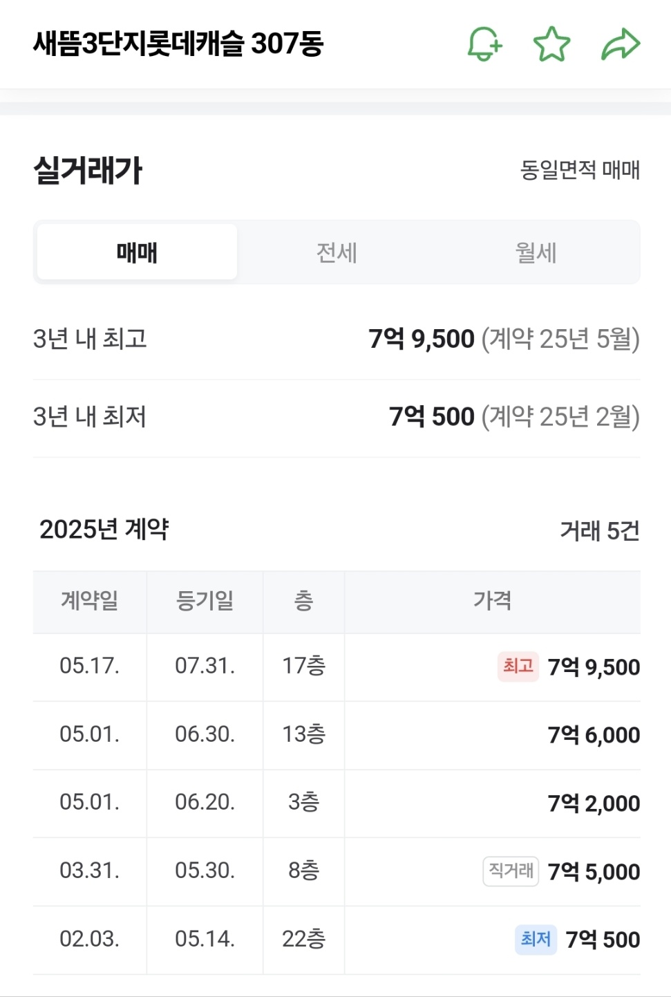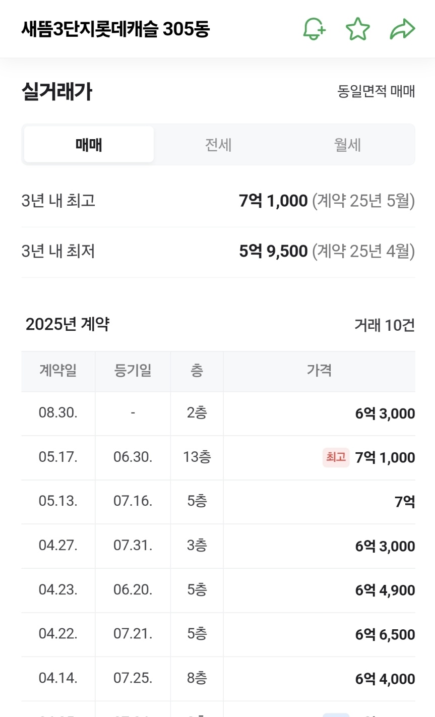 | 매매 | 2025-06-27 | 7층 | 약 같은 평수 (84.89㎡) | ₩610,000,000 |