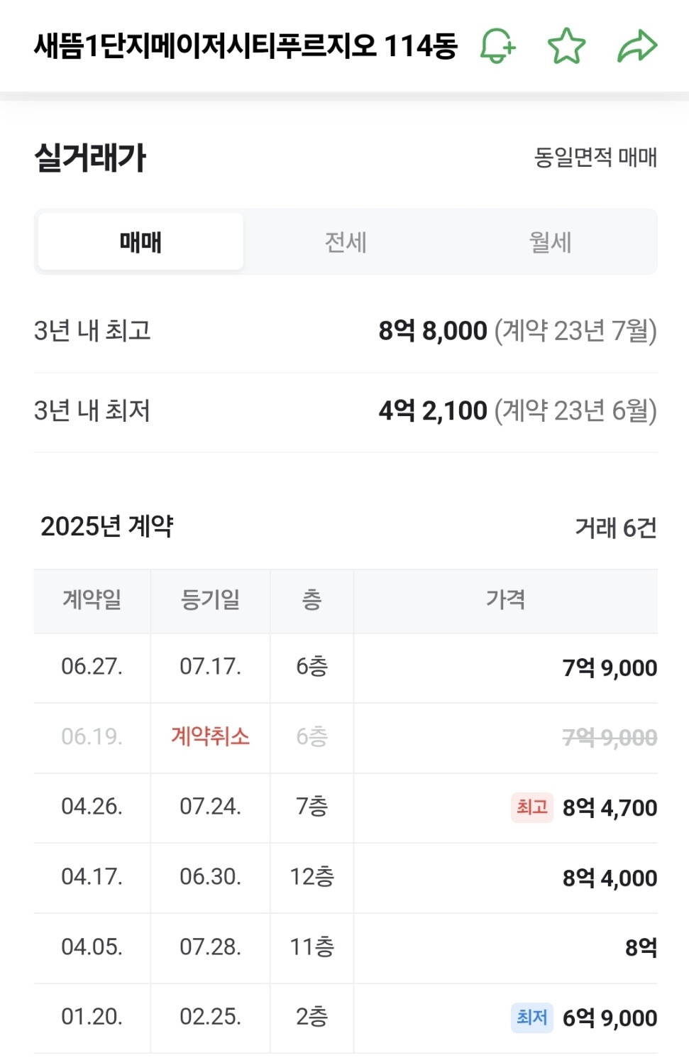| 매매 | 2025-08-23 | 10층 | 84.96㎡ (약 25평) | ₩682,000,000 |