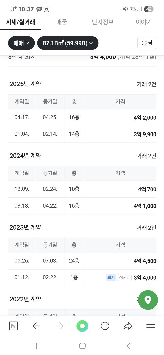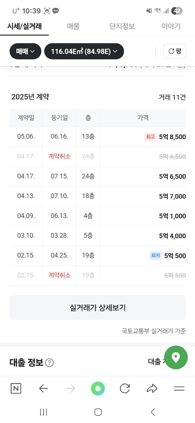 실거래가를 보면 타입별 가격 차이는 약간 있지만 59평형은 4억 초반대로 거래되고 있고 84평형은 5억 중후반대로 거래되고 있습니다.
