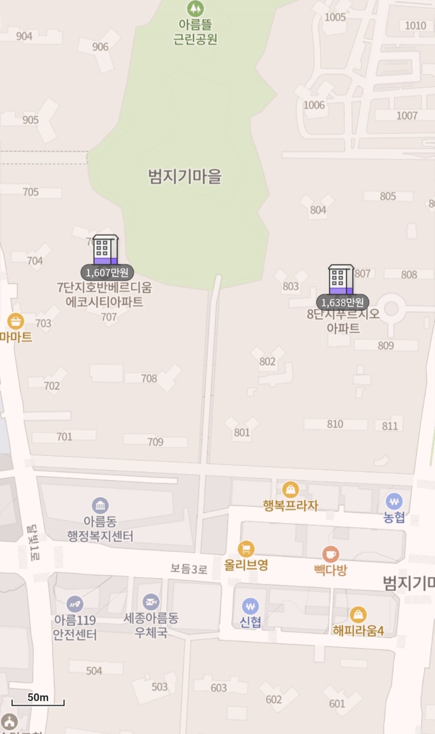범지기마을 7단지는 세대수가 약간 적은감이 있지만 8단지는 세대수도 600세대수가 넘어가 너무 적지않은 편이고 아름동 상권 바로 뒤에 있어 도보로 5분이면 모든 편의시설이 가능합니다. 주변에 초등학교, 중학교, 고등학교가 도보 10분거리에 모두 위치하여 있고 수영장과 복합커뮤니티시설,주민센터, 우체국, 소방서,경찰서 등 편의시설이 도보로 가능합니다. 아름동 상권을 세종에서도 알아주는 인프라입니다. 이렇게 빠짐없이 모든 편의시설이 도보로 가능하게 모여있는 동네는 아름동 뿐입니다. 왠만한 대형학원과 유명한 모든 과목의 학원이 들어와 있어 시간이 금인 고등학교아이들까지 모두 차로 이동하지 않고 학교부터 학원까지 원스톱으로 다닐 수 있습니다. 세종시에서 아이키우는 엄마들은 한번이상을 꼭 가본 입원가능한 아이들 병원까지 두루 갖추어져 있으며 카페나 식당, 지역생산물 시장인 싱싱장터까지 모두 갖추고 있습니다. 범지기마을 7단지와 8단지 사이에 작은 동산같은 산이 있어 일부세대에서는 조망권도 나오고 있습니다. 범지기 7단지의 경우 1.25대이 범지기 8단지 같은 경우는 주차도 1.3대로 넉넉한 편입니다.